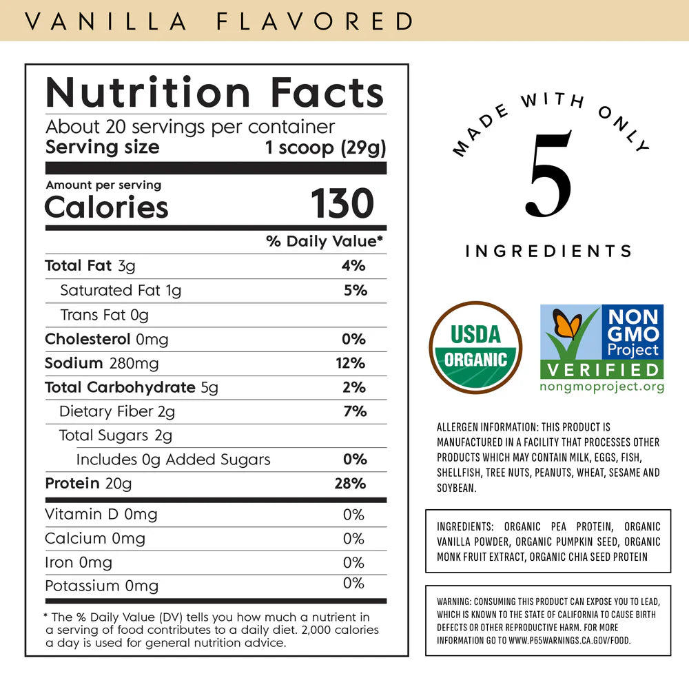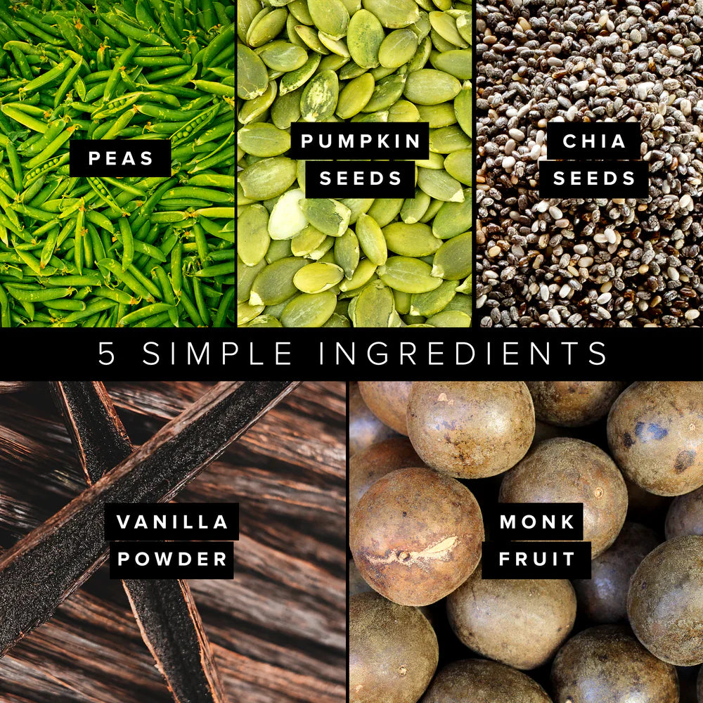 Ingredients: Organic Pea Protein, Organic Vanilla Powder, Organic Pumpkin Seed, Organic Monk Fruit Extract, Organic Chia Seed Protein.